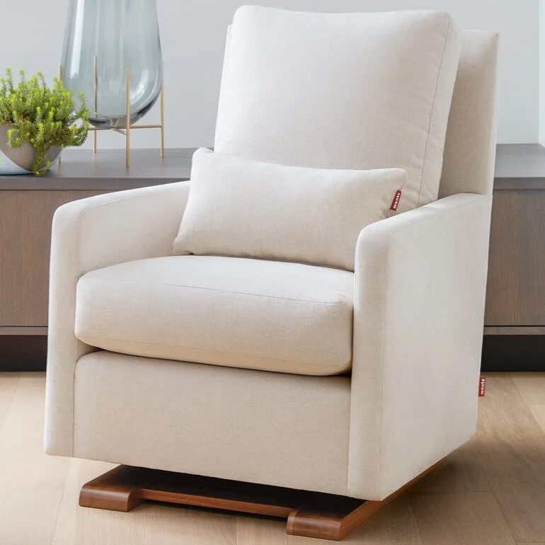 I was going to skip on a rocking chair/glider and then Rob professed that it was his dream to have one…so, the research began. I wanted a glider that looked chic enough to be in our home for years to come, not one that looked like it only belonged in a nursery. Monte Design delivered with gorgeous products! It handcrafts all of its products using sustainable practices and materials. The fabric is OEKO-TEX(R) certified and is free of flame retardants, and the wood is FSC Certified.